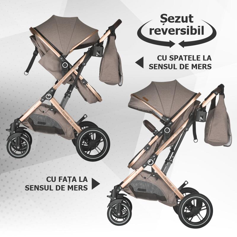 Caruciorul este format dintr-un cadru usor de aluminiu anodizat in culoare aurie, o unitate transformabila care se poate transforma din landou in unitate sport si viceversa in doar cateva miscari si un cosulet auto perfect atat pentru plimbarile cu masina, cat si scurtele escapade pe cadrul caruciorului.